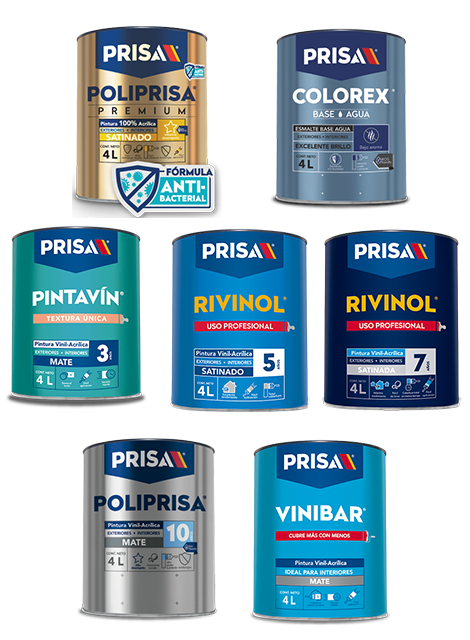 Pintura vinil, acrílica y esmalte base agua con acabado brillante, mate o satinado.